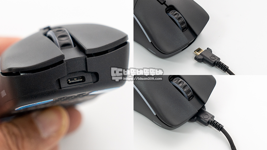 구분감이 약하게 느껴지는 휠 스크롤은 고속 회전도 정숙한 소음을 전해주며 유광 플라스틱이 사용된 DPI 변경 버튼은 조작감이 좋아 손쉽게 DPI 변경을 할 수 있었습니다.