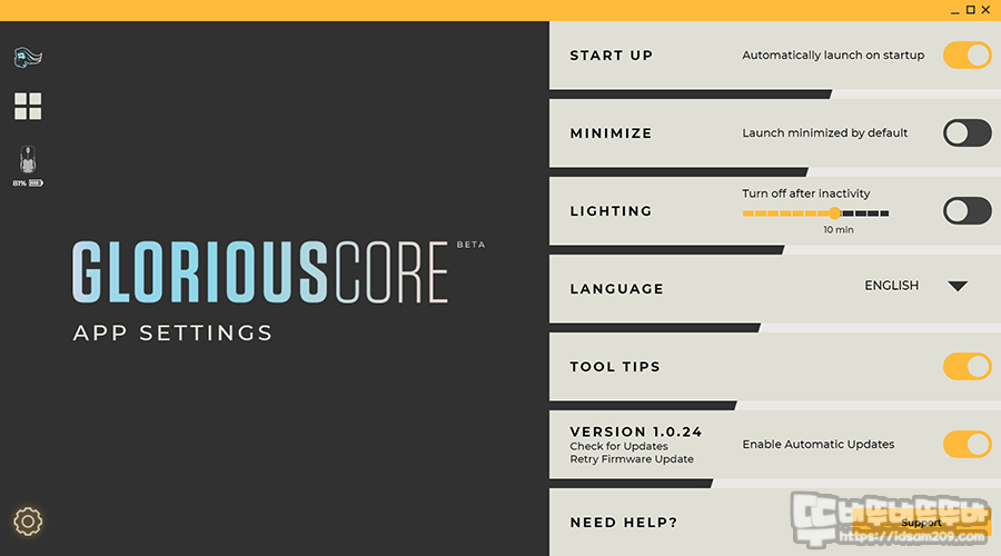 메인 화면 왼쪽 하단의 설정(톱니바퀴) 버튼을 누르면 볼 수 있는 화면에서는 Core 프로그램을 윈도우 시작 시 띄우기 설정, 최소화로 실행 설정, 일정 시간이 지나면 LED 라이팅 Off 설정 등이 가능하며 기본 영문만 지원하기에 언어 부분은 패스하시고요.