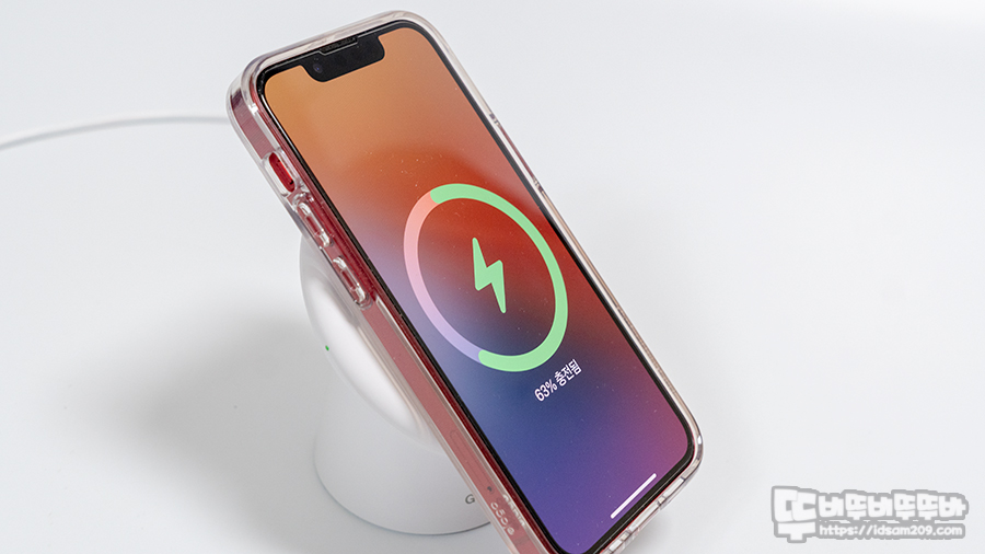 맥세이프는 아이폰 내부의 자석과 무선 충전기 내부의 자석이 결합하는 방식이기에 두께가 있는 케이스를 사용하는 경우 자석의 체결력이 떨어질 수 있으니 가급적 케이스를 사용하지 않거나 맥세이프 전용 케이스를 사용하시는 게 좋으니 참고하시기 바랍니다.
