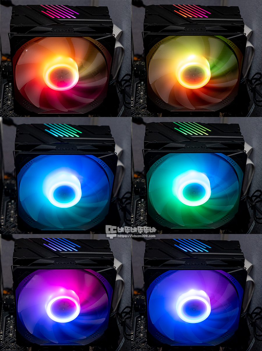 upHere N1055CF AUTO RGB (BLACK) CPU 쿨러는 ARGB 지원은 하지 않지만 선 정리 없이 간편하고 충분히 현란한 RGB LED 효과를 보여주는 제품이기에 꽤 만족스럽게 사용할 수 있으니 참고해 주시기 바랍니다.