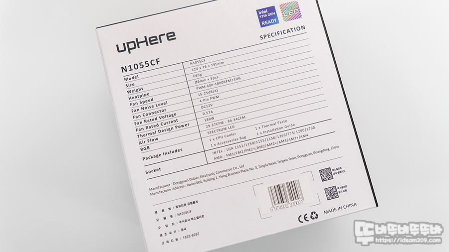 제품은 upHere N1055CF 쿨러, 사용설명서, 인텔/AMD 공용 브라켓 및 백플레이트, 추가 쿨링팬 고정 클립, 할른지예 써멀 구리스, 고정너트 & 볼트, 스프링 볼트, 스탠드 오프로 구성되어 있습니다.
