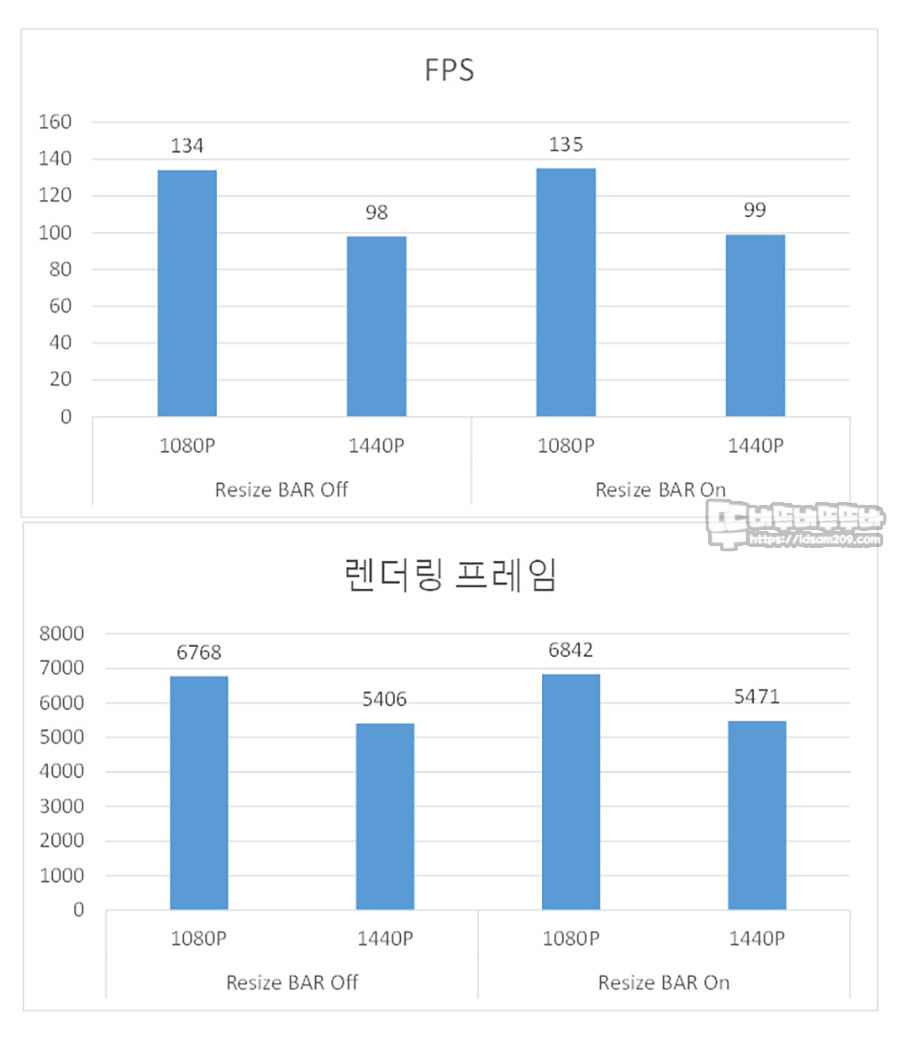 Far Cry 6 벤치를 통해 Resize BAR On/Off 설정에 따른 퍼포먼스를 살펴보면 1080p 해상도에서는 약 70 렌더링 프레임, 1440p 해상도에서는 약 65 렌더링 정도의 상승을 확인할 수 있었습니다.