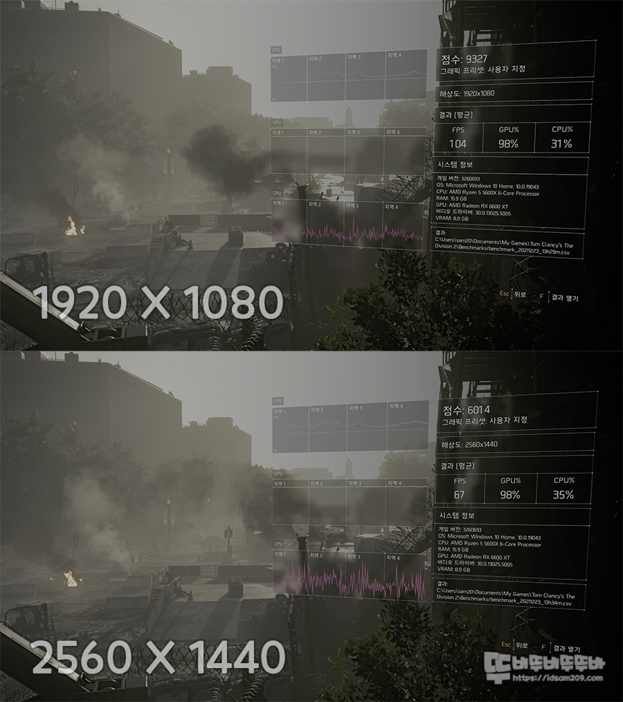 더 디비전 2에서는 1440p 해상도와 1080p 해상도를 번갈아가며 FPS와 그래픽 점수 차이를 확인해 보았는데요.