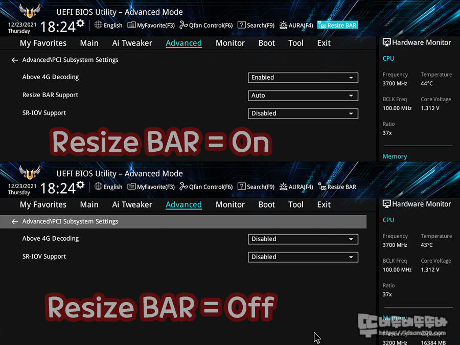 SAM(라라랜드) 구성은 Advanced 메뉴의 PCI Subsystem settings 메뉴의 연동으로 설정되는 바이오스 상단에 Resize BAR On/Off로 간단하게 설정할 수 있습니다.