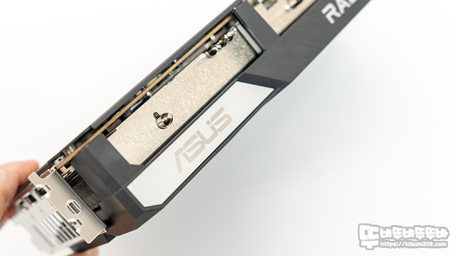 그래픽 카드 뒷면에는 휨 방지를 위한 알루미늄 백플레이트와 오픈된 구조에 GPU 브라켓을 확인할 수 있는데요.