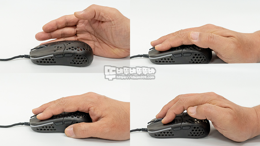 필자의 손은 F 펑션열 기준 한 뼘으로 F11, 중지 기준 F10 절반의 크기로 큰 편에 속하며 마우스 그립 시 핑거 그립으로 사용하게 되는데 평소에 잘 쓰지 않는 그립이다 보니 조금 적응하기가 어려운 부분이 있지만 초경량 마우스답게 FPS 게임 플레이 시 빠른 이동으로 반응력이 좋은 편이며 손이 건조해서 그런지 반투명 재질이 갖고 있는 미끄러움에 마우스 버튼을 같은 자리를 클릭하는데 어려움이 있었습니다.