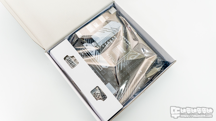 제품은 메인보드, 사용 설명서, 드라이브 DVD, I/O 실드, SATA3 케이블 2개, M.2 스탠드오프+고정나사, M.2용 스펀지로 구성되어 있습니다.