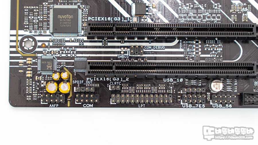 PCB 인쇄 내용을 살펴보면 M.2 1번과 2번 슬롯에서 PCIe 4.0 x4 만 지원하고 그리고 2번 슬롯에서 옵테인 메모리 지원을 확인할 수 있습니다.