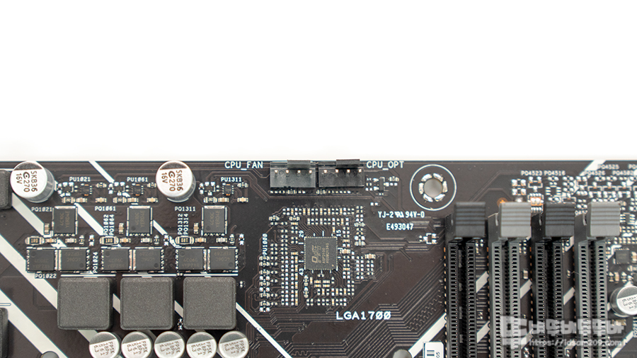 제품의 I/O 관련 부분을 살펴보면 상단에는 8핀 보조전원과 CPU_FAN, CPU_OPT 커넥터
