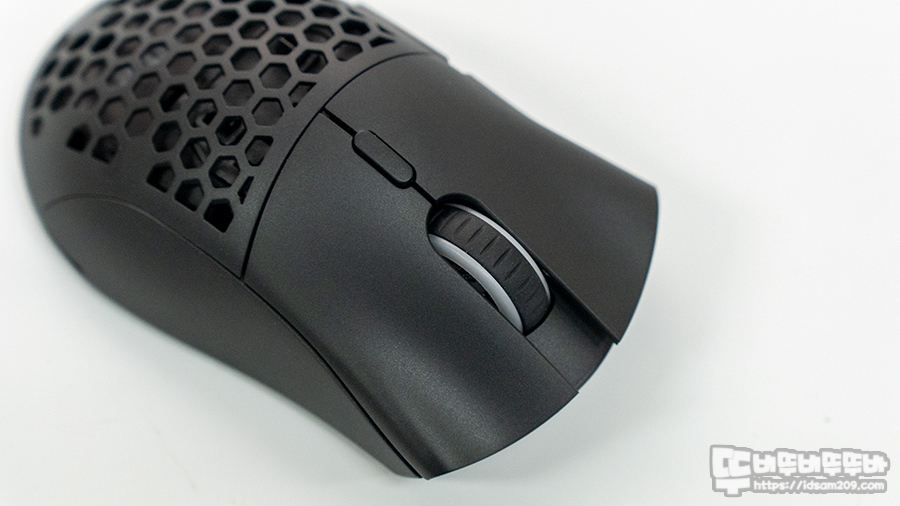 마우스 상단에는 DPI 변경 버튼과 DPI에 해당하는 LED가 표시되는 휠 스크롤이 적용되었습니다.