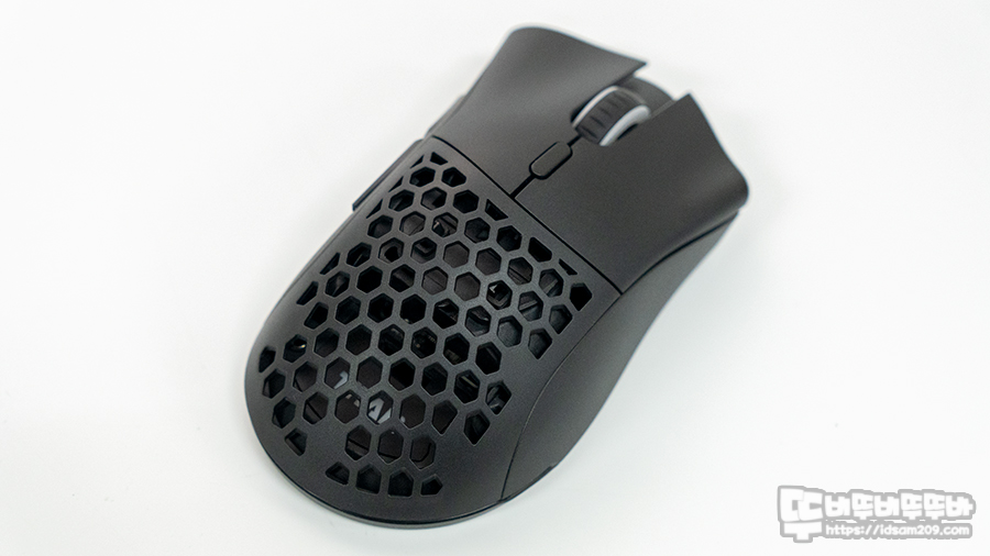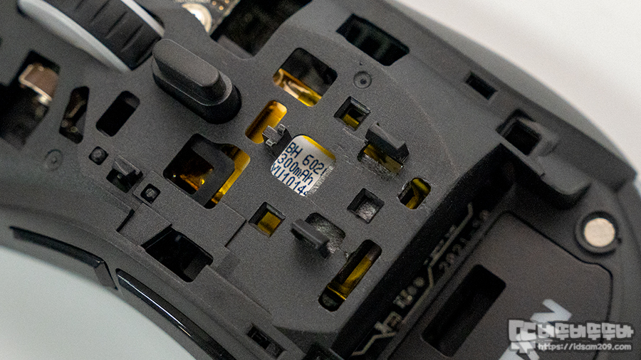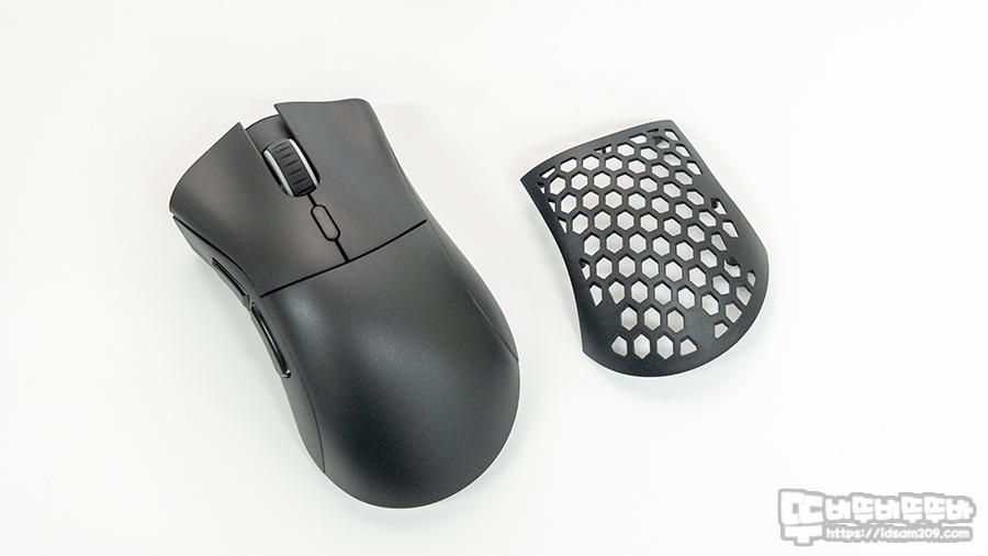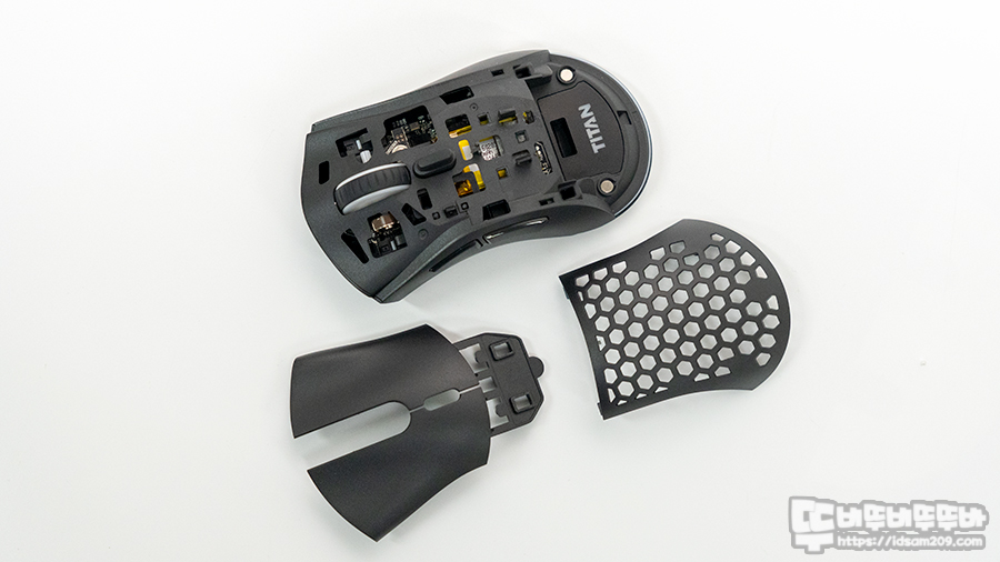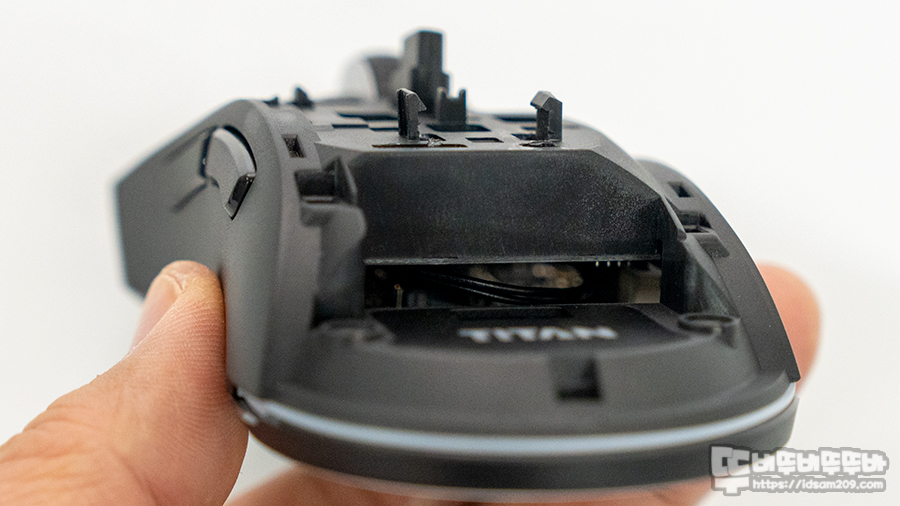 버튼 커버와 팜커버를 분리 시 경량화를 위해 마우스 하우징 상단에 타공이 적용된 것을 확인할 수 있으며 11자 형태의 걸쇠형 돌기로 인해 버튼 커버 교체가 쉽지 않으니 가급적 분리하는 않는 걸 추천드립니다.