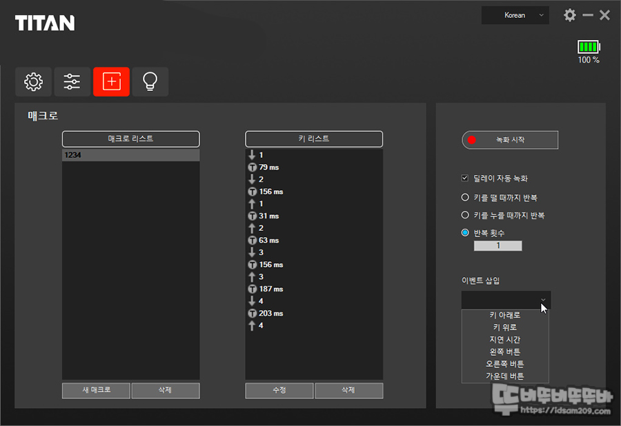 매크로 기능은 매크로 파일명 생성 이후 녹화 시작 버튼을 눌러 키 입력을 저장하는 과정을 거치는데 보통의 게이밍 마우스의 매크로 기능과 동일하여 어려움 없이 사용이 가능합니다.
