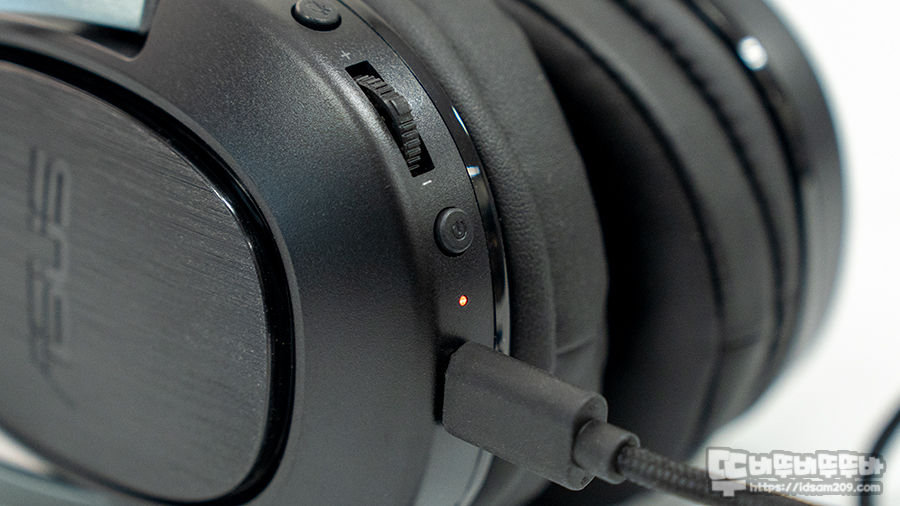 왼쪽 이어컵 하우징 부분에 위치한 컨트롤부를 살펴보면 마이크 On/Off 버튼, 조그 방식의 볼륨 버튼, 전원 버튼과 전원 LED 인디케이터, USB-C 충전 포트로 구성되어 있으며, 조그 방식의 볼륨 버튼의 경우 위/아래 틸트 방식 그리고 누르는 방식으로 볼륨 및 음소거 조절을 간편하게 사용할 수 있습니다.