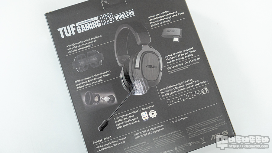 ASUS TUF H3 WIRELESS 게이밍 헤드셋 패키지에는 제품의 이미지와 TUF Gamming H3 Wireless 모델명, USB-C 타입의 무선 리시버 그리고 teamspeak, 디스코드 인증과 PS5 지원에 대한 내용을 확인할 수 있고요.