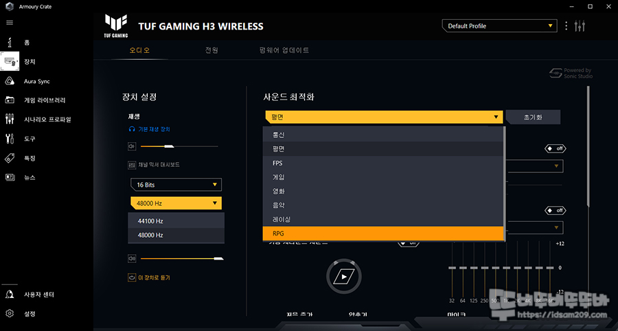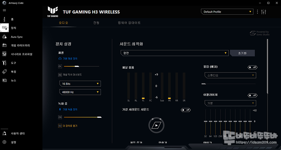 제어판 - 소리 설정에서 TUF H3 Wireless 장치로 연결된 것을 확인할 수 있으며 마이크와 스피커 모두 16비트, 48kHz 음질을 지원합니다.