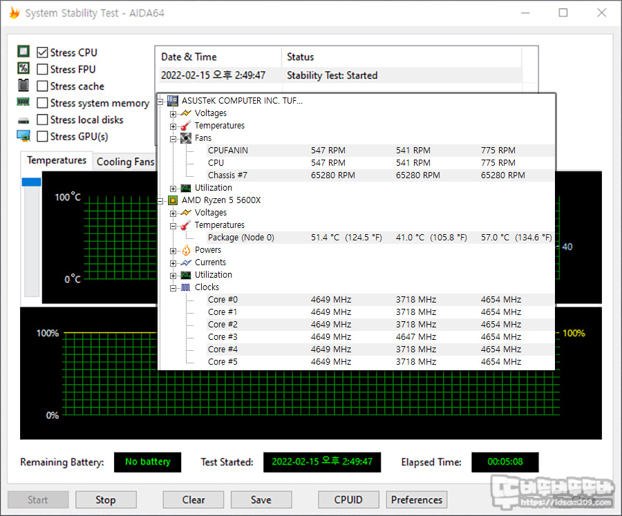 ASUS Fan Xpert4 Standard 기준으로 Stress CPU 5분간 테스트 시 약 51.4도 온도, 5분 이후로는 Full Speed로 10분간 테스트 시 약 43도를 유지하는 것을 확인할 수 있었습니다.