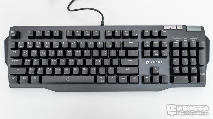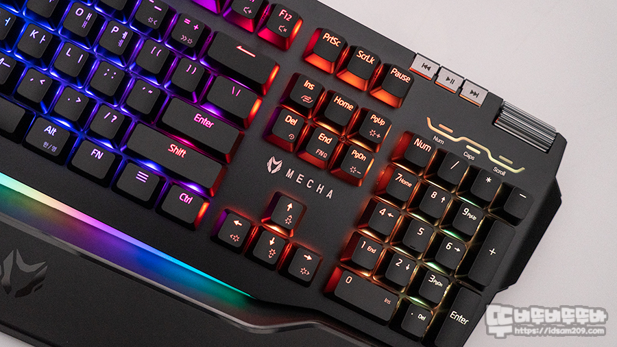 펑션열에 Fn 키 조합으로 사용하는 미디어 제어키와 중복되긴 하지만 Fn 조합이 아닌 단독으로 빠르게 실행할 수 있는 미디어 제어 버튼은 직관적인 사용이 가능하며 360도 무한으로 돌아가는 볼륨노브는 편리하게 사용할 수 있어 좋았네요.