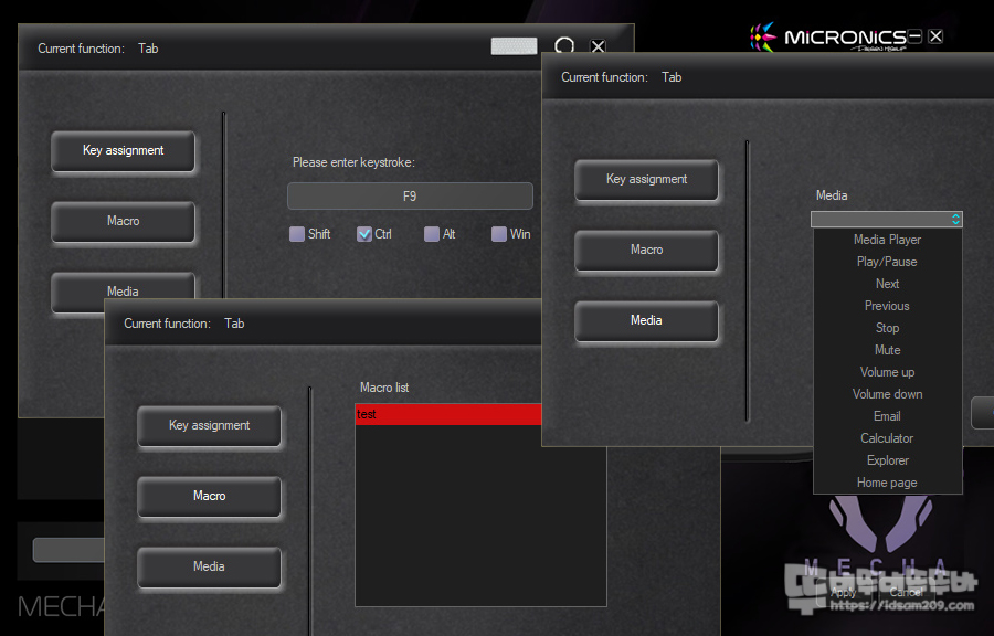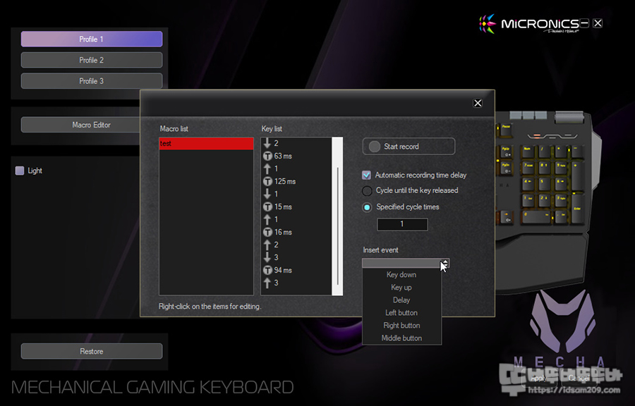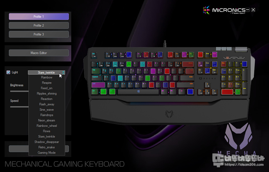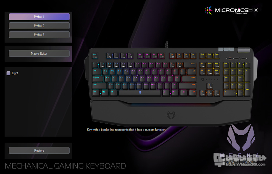 마이크로닉스 MECHA ZK-1 소프트웨어는 왼쪽에 메뉴에 프로파일 선택화 매크로 에디터, Light 설정하는 기본 메뉴 그리고 오른쪽에 키보드 키를 눌러서 키에 기능을 부여하는 메뉴 구성으로 심플하면서 직관적인 구성으로 되어있는데요.