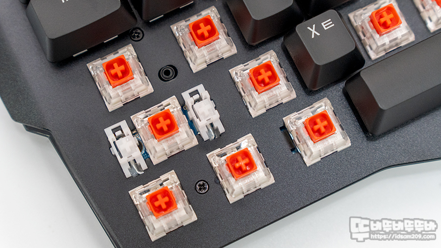 스위치는 카일사의 박스 축 중에 적축이 사용되었으며 스테빌라이저는 체리 방식 디자인에 스템이 분리되는 형태인데 기본 윤활 처리가 되어있으며 키캡 분리 시 랜덤하게 스템이 분리되는 경우가 발생하니 분실 또는 키캡 결함 시 파손에 주의하시기 바랍니다.