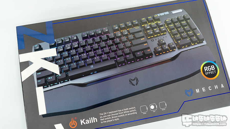 마이크로닉스 MECHA ZK-1 RGB 게이밍 기계식 키보드 패키지는 오링 커버가 사용되는 컬러 패키지에 제품의 외형과 모델명 그리고 스위치 정보 그리고 제품의 특징이 영문으로 표기되어 있는 게 특징입니다.