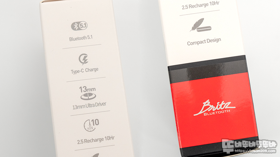 패키지 측면에는 블루투스 5.1 버전, USB-C 충전 지원, 13mm 드라이버 유닛 사용, 2.5회 추전으로 10시간 사용, 컴펙트 디자인 등 제품의 특징을 간략하게 표현하고 있습니다.