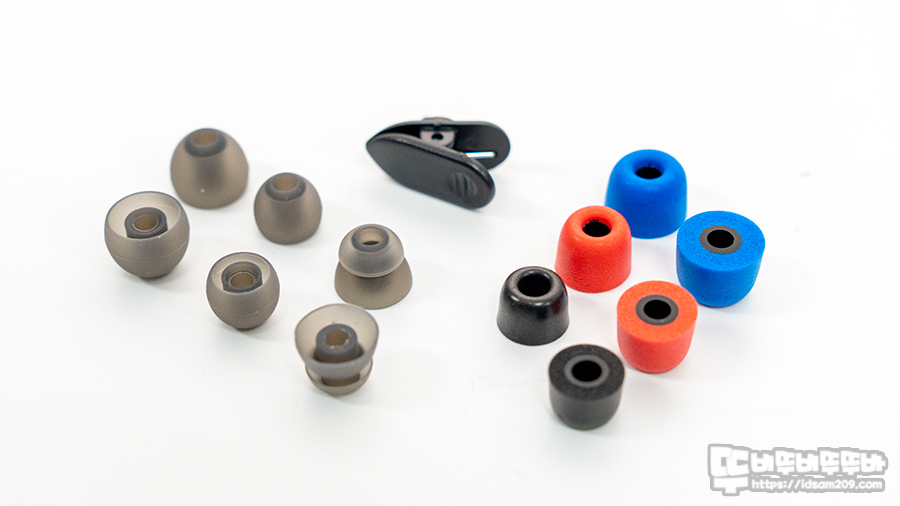 기본 구성품으로 제공되는 실리콘 및 메모리폼으로 제작된 다양한 이어팁과 이어폰 고정 클립 모습.