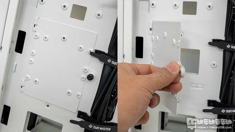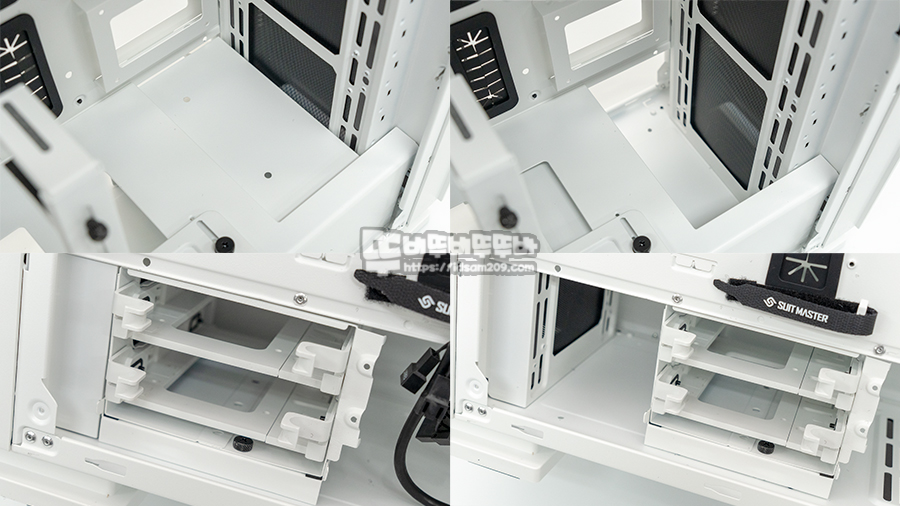 그리고 케이스 하단 HDD/SSD 베이를 고정하고 있는 고정 나사를 확인할 수 있는데요.