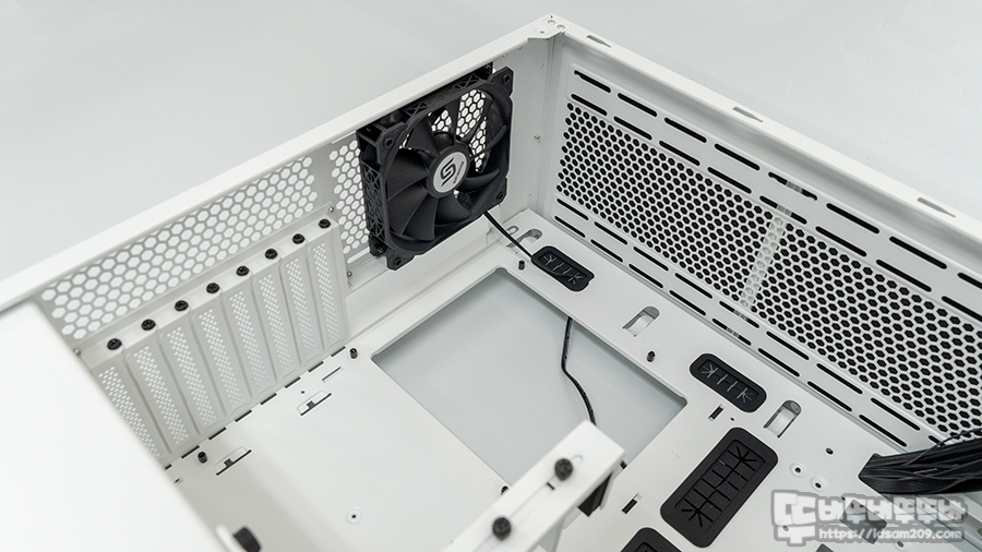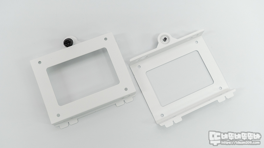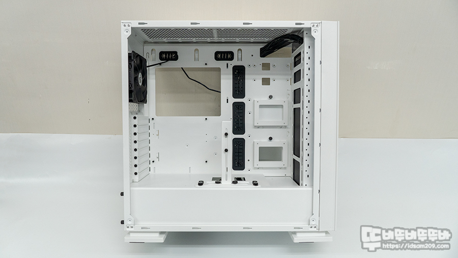 샤시 내부 모습을 살펴보면 화이트 컬러라 그런지 상단과 중앙 부분에 케이블 정리 홀에 부착된 실리콘 커버가 눈에 띄며 앞쪽 부분에 SSD 전용 브라켓 모습을 확인할 수 있습니다.