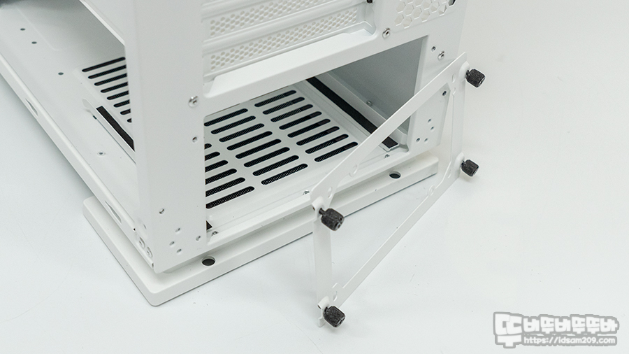 케이스 바닥면을 살펴보면 케이스 샤시를 안정적으로 지지하는 구조로 디자인된 널찍한 다리와 탈부착이 수월한 먼지필터 모습.