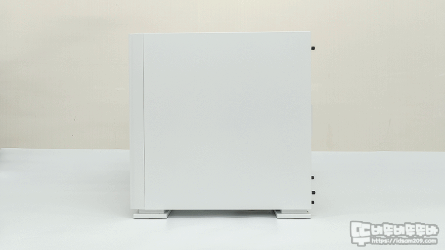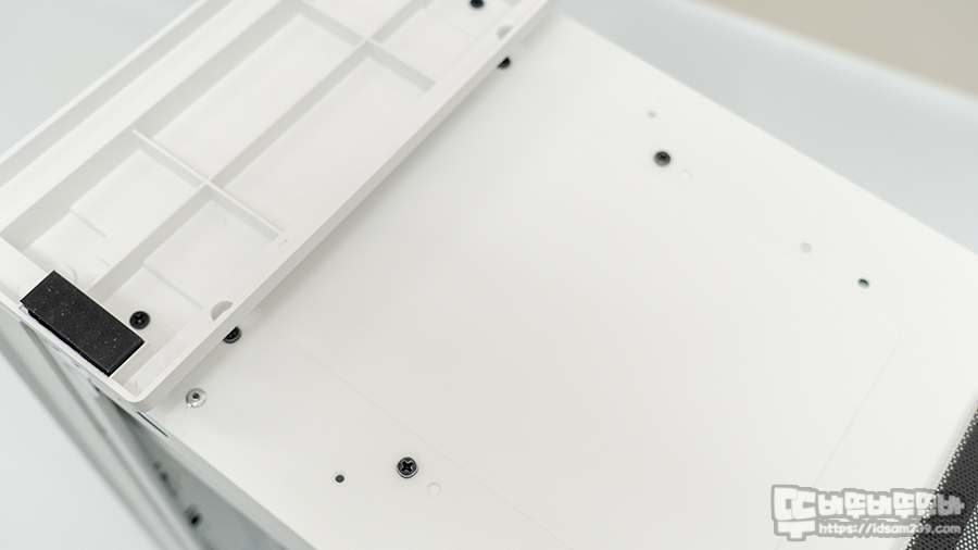 반대되는 부분으로는 전면에 쿨링팬 미제공, 샤시 하단면에 케이블 정리 홀 미지원, 최대 E-ATX 지원이라고 표기하고 있지만 편안한 조립을 기준으로 한다면 ATX 메인보드까지가 최대인 점 그리고 공용으로 사용되는 케이스 샤시를 베이스에 흡음 패드가 내장된 패널을 사용하다 보니 전면 패널을 통한 공기 유입이 조금 아쉬운 점을 꼽을 수 있습니다.