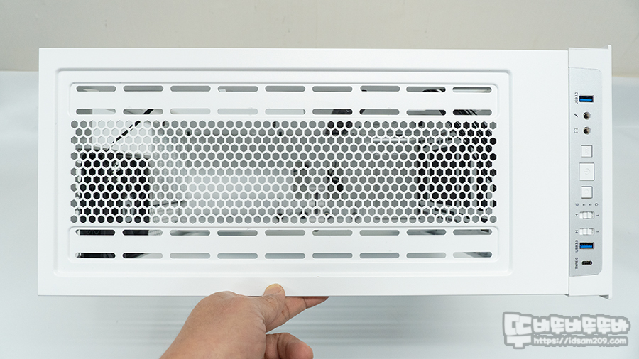 샤시 상단에는 120/140mm 쿨러 및 라디에이터를 장착할 수 있는 구성으로 디자인된 것을 확인할 수 있으며 아쉽게도 먼지 필터는 제공되지 않습니다.