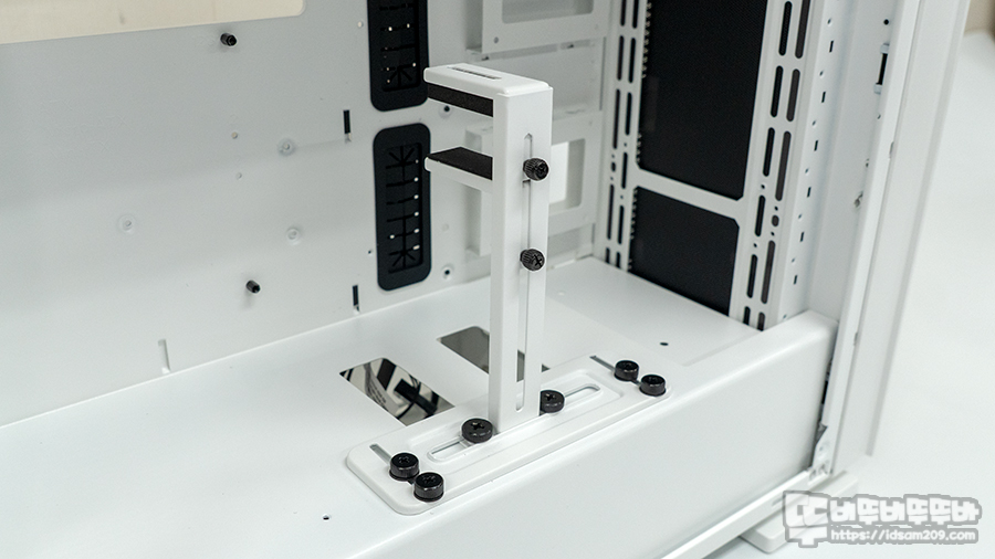 케이스는 메인보드가 장착되는 공간과 파워 서플라이가 장착되는 공간이 분리되는 듀얼 챔버로 디자인되었으며 파워서플라이가 장착되는 공간 즉, 샤시 바닥면에는 그래픽카드 지지대를 기본으로 제공하고 있는 게 특징입니다.