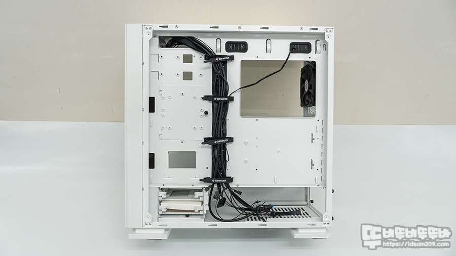 케이스 샤시 뒤쪽은 전체적으로 케이블 정리가 용이한 구조지만 중앙에 케이블이 두껍게 모일 경우 사이드 패널이 닫히지 않으니 그 부분만 주의하시면 될 거 같습니다.