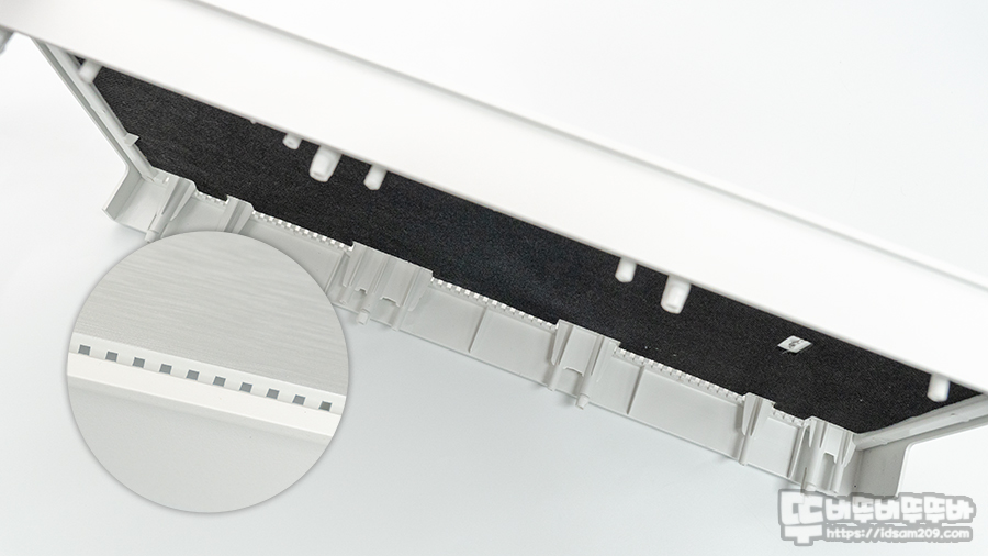 전면 패널 내부에 흡음재 적용이 되어있으며 전면 패널의 공기 유입은 패널 전면에 미세한 타공 처리된 구멍을 통해 유입되는 구조를 확인할 수 있습니다.