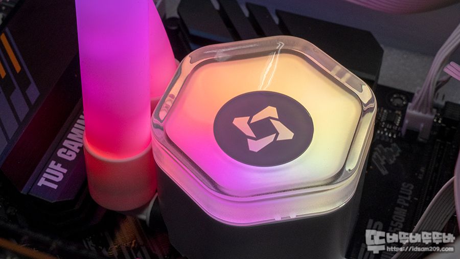 라디에이터에 장착된 쿨링팬과 워터블럭 특히 LED 튜브에 AGB가 표현되기에 상당히 밝은 밝기를 보여주고 있습니다.