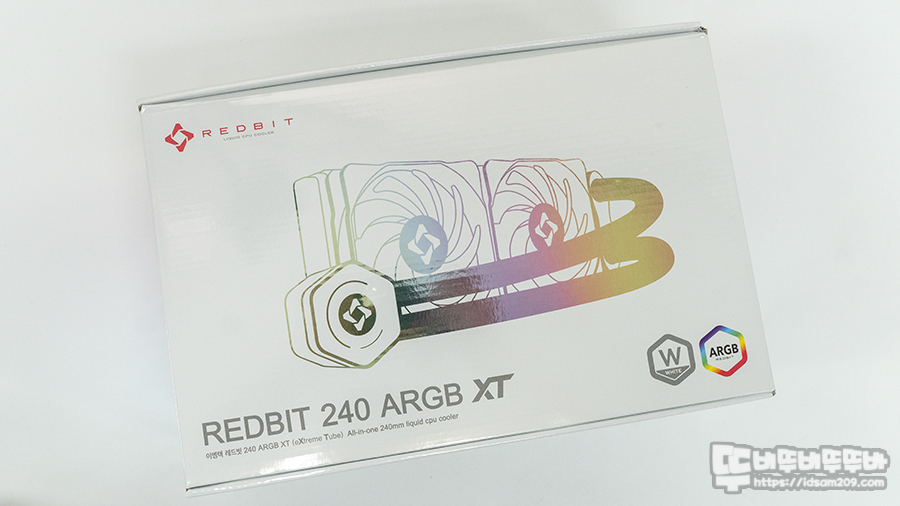 이엠텍 레드빗 240 ARGB XT 수랭 쿨러 패키지는 보이는 각도에 빛 반사로 반짝이는 인쇄로 표현된 제품의 모습과 모델과 그리고 ARGB 및 W(화이트) 컬러가 강조되고 있고 패키지 전체가 비닐 실링 처리가 되어있어 패키지 개봉하는 맛이 납니다.