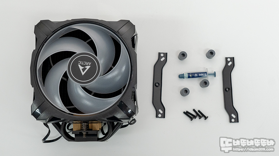 ARCTIC Freezer A35 A-RGB AMD CPU 쿨러 구성은 쿨러 본체와 AMD 브라켓, 4개의 스탠드오프, 브라켓 고정나사, MX-5 0.8g으로 구성되어 있습니다.