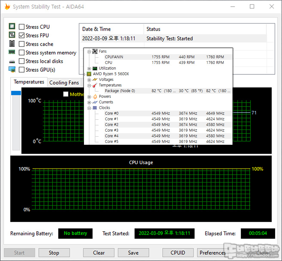 기존에 이런저런 테스트를 해보아도 오픈 케이스 테스트 시 극한 성능을 보여주는 방식이 AIDA64 시스템 안정화 테스트밖에 없어 AMD 기본 쿨러와 ARCTIC Freezer A35 A-RGB AMD CPU 쿨러 장착으로 온도 차이를 확인해 보았습니다.
