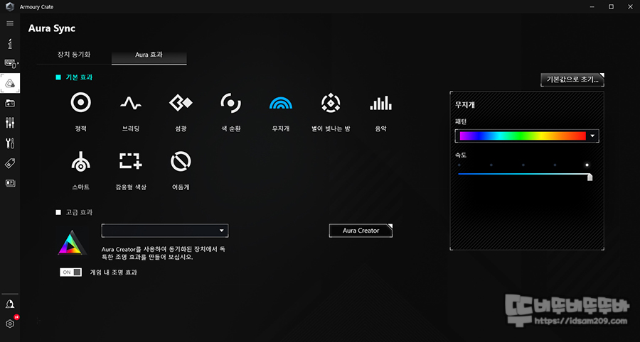 단색 효과와 레인보우 효과 이외에는 크게 당기는 효과가 없는 편이라 Aura Sync를 사용하게 되면 기본적으로 레인보우 효과를 사용하게 되는데요.