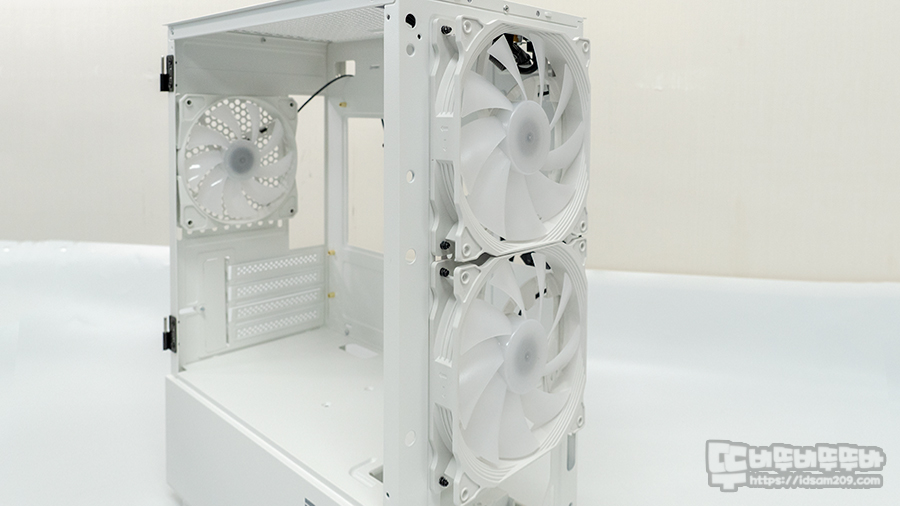 제품에 사용된 쿨링팬은 IDE 4핀 전원을 이용한 고정 화이트 LED 및 고정 RPM 제품으로 850 rpm의 21.3dBA 소음의 전면 140mm 쿨링팬 2개 그리고 1000 rpm의 21.7 dBA의 소음의 120mm 쿨링팬 1개가 사용되었고요.