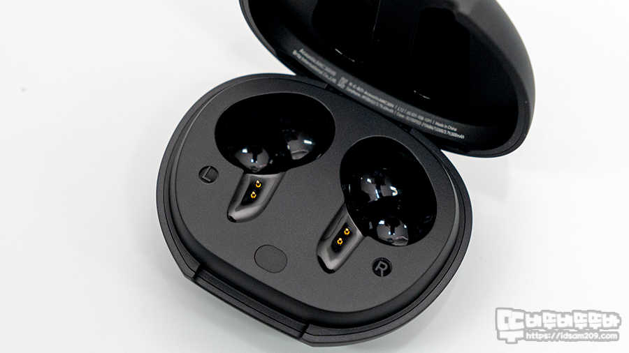 충전 케이스 내부는 여느 제품과 동일하게 이어버드가 충전 케이스 내부의 자석과 결합되면서 충전 핀이 접촉되는 방식으로 충전하게 되며 케이스 중앙에 페어링 버튼 그리고 좌우로 L, R 각인을 확인할 수 있고요.