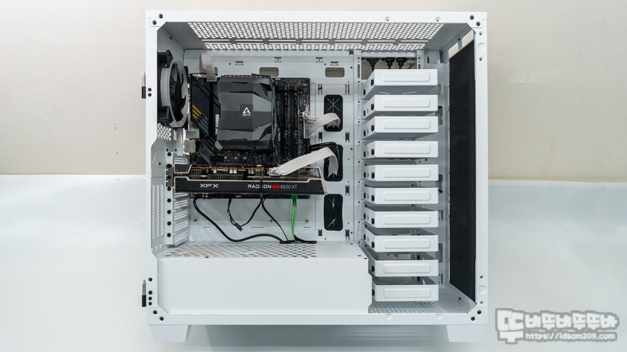M-ATX 메인보드 구성이라 꽤 널널한편인데 상단 또는 전면에 수랭 쿨러를 사용할 경우 필요에 따라 전면 베이를 분리하여 사용하시는 것도 방법이니 참고하세요.