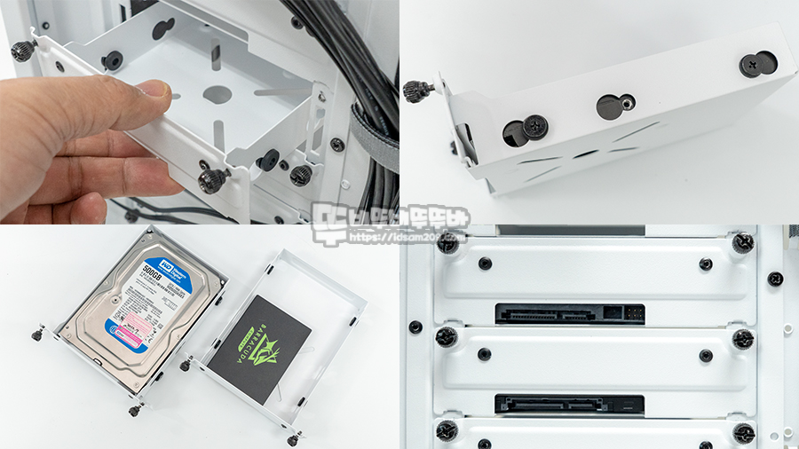 손나사를 풀어서 분리할 수 있는 샤시 전면에 전용 베이는 측면에 진동 방지 댐퍼가 부착되어 있어 HDD 측면의 고정 홀과 댐퍼를 맞춰 전용 나사로 결합하시고 SSD는 바닥면에 전용홀을 참고하여 결해주시면 됩니다.