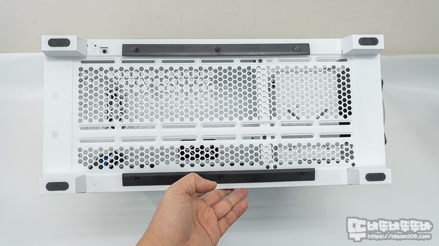 케이스 바닥면에는 슬라이딩으로 분리가 가능한 플라스틱 베이스의 먼지 필터 모습과 케이스를 안정적으로 지지하는 다리 모습을 확인할 수 있으며 케이스 바닥면 샤시의 경우 샤시 상단과 데칼코마니 느낌을 확인할 수 있습니다.
