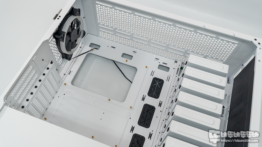 샤시 내부를 살펴보았을 때 특징이라면 샤시 중앙 부분에 케이블 정리 홀을 가려주는 실리콘 커버 모습과 8개의 PCI 가이드 및 가로로 사용 가능한 3개의 PCI 가이드를 확인할 수 있으며 파워서플라이를 장착하는 공간의 타공 처리된 샤시가 눈에 띕니다.