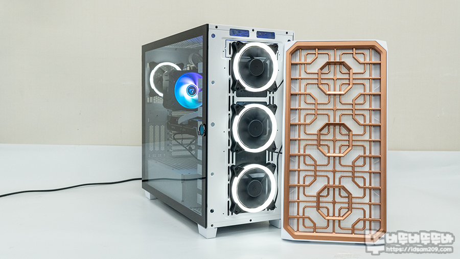 자석으로 탈부착이 가능한 전면의 창호 무늬와 3면 먼지 필터 등으로 실용적인 면도 있고 샤시의 케이블 정리 홀에 실리콘 커버가 고정되지 않는 불편함, 공정에 누락된 나사 등 QC 부분에서 살짝 아쉬운 부분도 있지만, 빅타워 디자인이기에 크기가 부담되는 부분도 무지하지 못할 거 같네요.