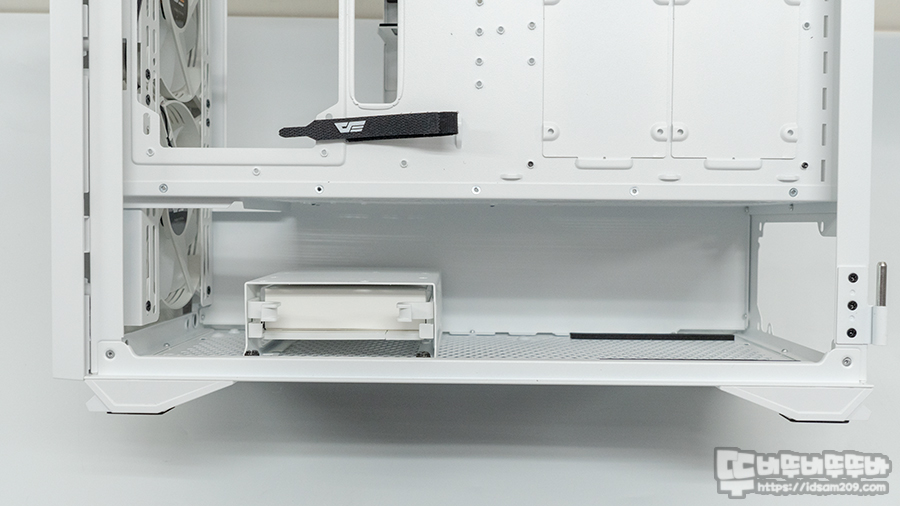 탈부착이 가능한 SSD 전용 가이드와 하단 챔버의 파워서플라이 장착 공간과 HDD 베이를 확인할 수 있습니다.