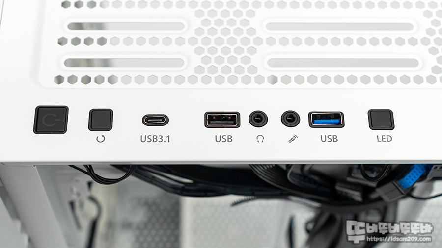 샤시 내부를 거치지 않고 조립할 수 있는 샤시 뒤쪽에 위치한 I/O 포트는 왼쪽부터 전원 스위치, 리셋 스위치, USB 3.1 (C타입), USB 2.0, HD 오디오, USB 3.0, LED 버튼으로 구성되어 시스템 조립 시 케이블 정리가 한층 편안한데요.