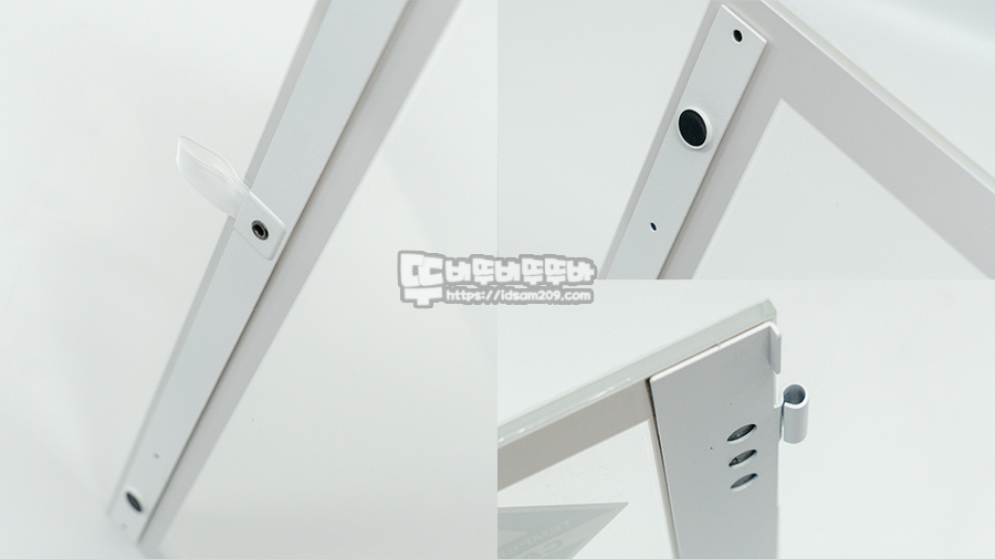 강화유리 사이드 패널의 경우 패널 테두리를 화이트 컬러로 마킹하여 케이스 샤시 측면이 노출되는 것을 방지하며 안쪽에는 앞쪽에 샤시 고정용 자석과 나일론 손잡이 뒤쪽에는 경칩 구조의 프레임이 부착되어 있고요.