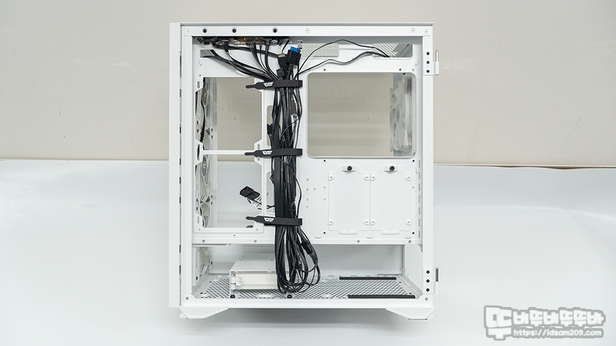 샤시 뒷면을 살펴보면 중앙 부분에 고정된 벨크로 타이로 고정된 I/O 포트 케이블과 전면에 120/240mm 쿨러 및 수랭 쿨러 라디에이터 장착이 가능한 공간이 눈에 띄네요.